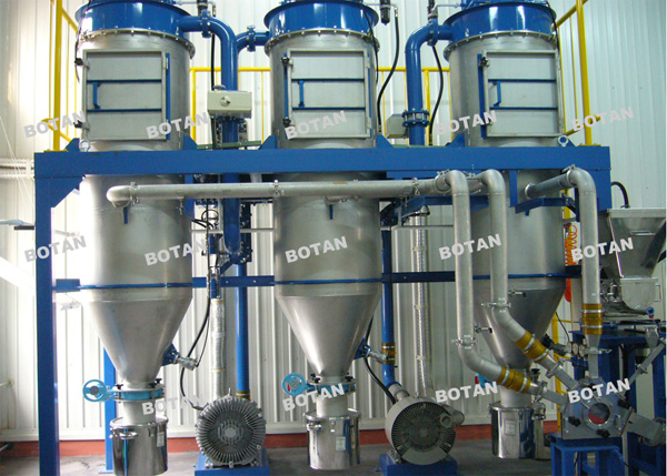 由于氣流的脈動及瞬間的不穩(wěn)定會使得少部分的較粗的顆粒流入其他的通道,并從下料口排出。中細顆粒和超細顆粒也同樣在離心力和氣流的作用進入不同的通道,分為粗、中、細三個品種。